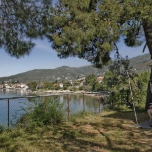 Through the shady olive grove, the guest can reach Sikia beach, situated in front of the camping. Sikia offers a sandy beach for both children and adults. There is also a rocky bay for snorkling and swimming. As part of the offered facilities is the family taverna, the seaside bar and a grocer’s shop. Among others there is also a multi-purpose sports field for basketball, mini football and volleyball.